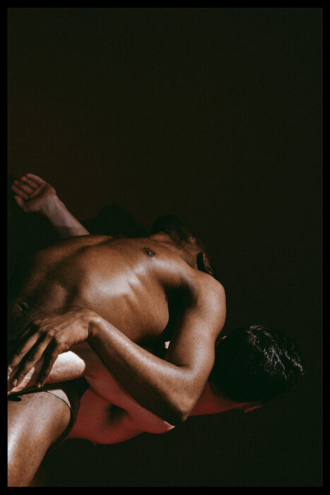 Mid torso and legs of dancer against red background in Brooklyn studio